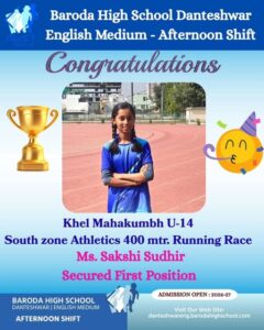 Huge congratulations to our athletic star Ms. Sakshi Sudhir (8C) for securing 1st position in “Khel Mahakumbh U14 South Zone Athletics 400m running at Zonal Level”