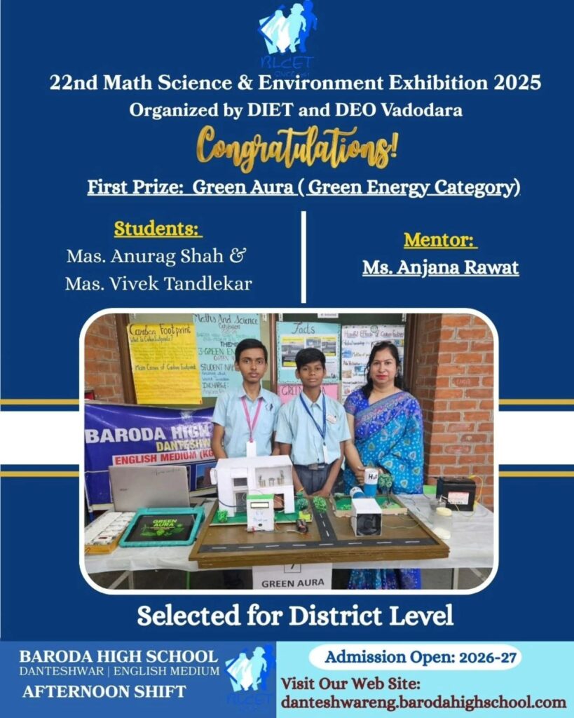 🎊Baroda High School Danteshwar English Medium Afternoon Shift🎊 🌟✨ Selected for District Level- Celebrating the Young Innovators! ✨🌟 Meet the brilliant minds of Mas Anurag Shah and Mas Vivek Tandlekar from Std. 9, who lit up the stage at the 22nd Math Science & Environment Exhibition 2025 organized by GCERT Gandhinagar in collaboration with DIET, […]