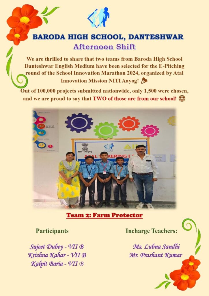We are thrilled to share that two teams from Baroda High School Danteshwar English Medium have been selected for the E-pitching round of the School Innovation Marathon 2024, organised by Atal innovation Mission NITI Aayog