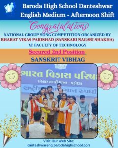 We feel thrilled to share that students of Baroda High School Danteshwar English Medium Afternoon Shift performed exceedingly well in ‘Rashtriya Samuhgaan Pratiyogita’ 2025 organized by Bharat Vikas Parishad.